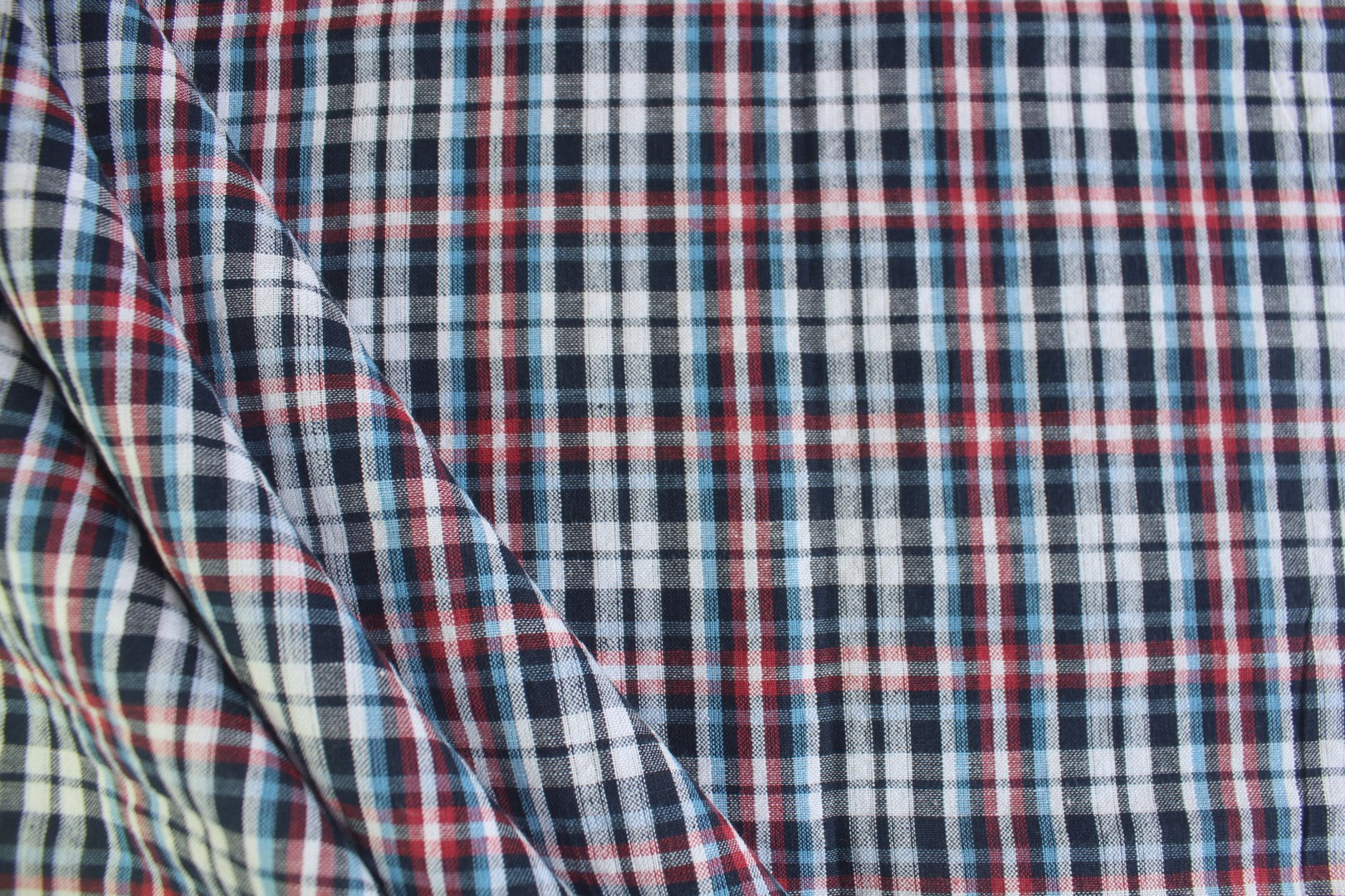 This 100% Cotton Seersucker Fabric features a compact navy, red, and white checkered pattern with subtle blue accents. The puckered texture offers enhanced airflow and wrinkle resistance—perfect for effortless summer wear.