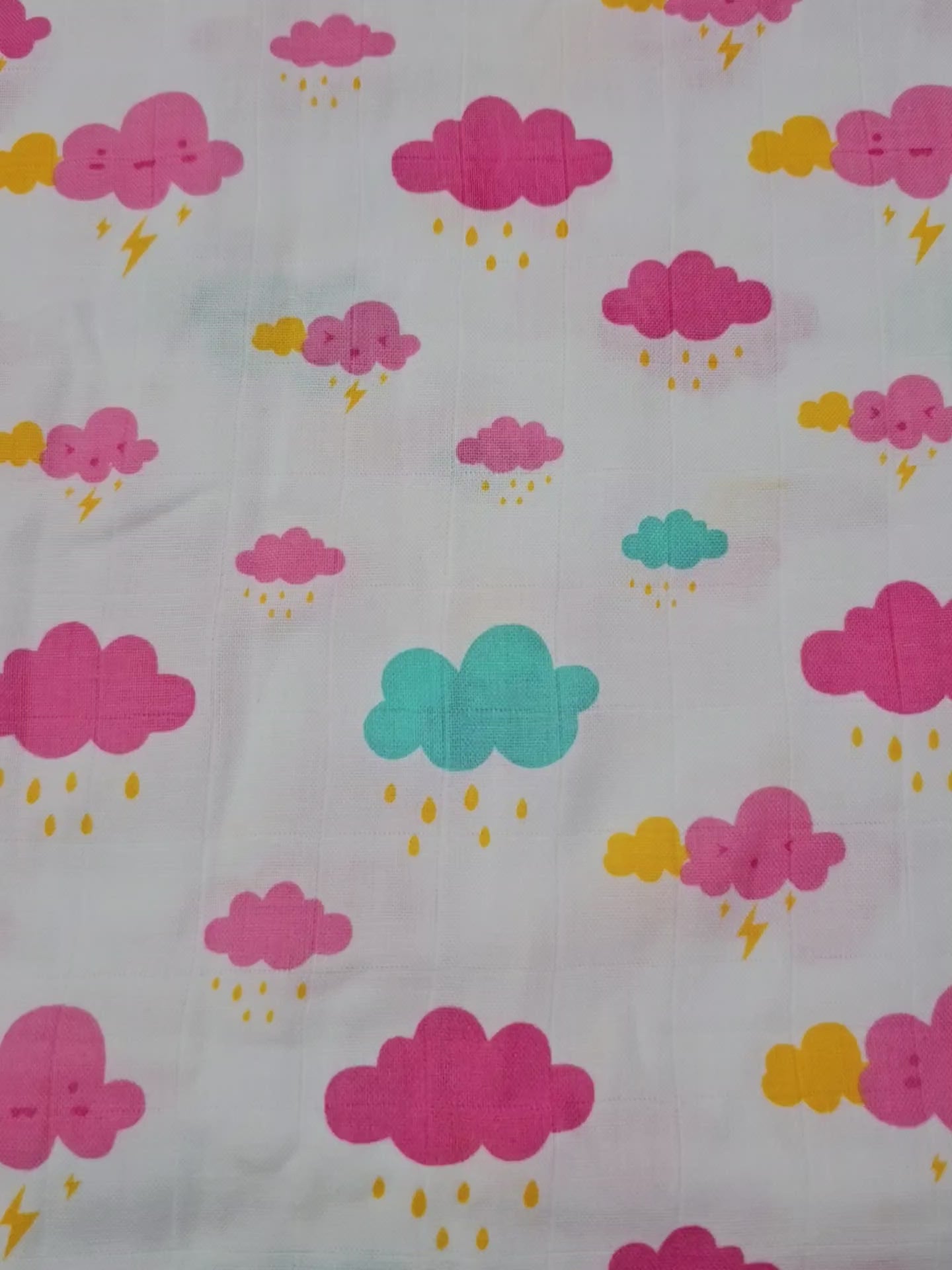 Our Cloud Print Double Gauze Fabric is made from 100% cotton and features a soft white base adorned with dreamy cloud motifs. The fabric has a subtle flat check woven texture, offering visual interest while remaining ultra-gentle and breathable — perfect for baby apparel, nursery accessories, and lightweight wearables.