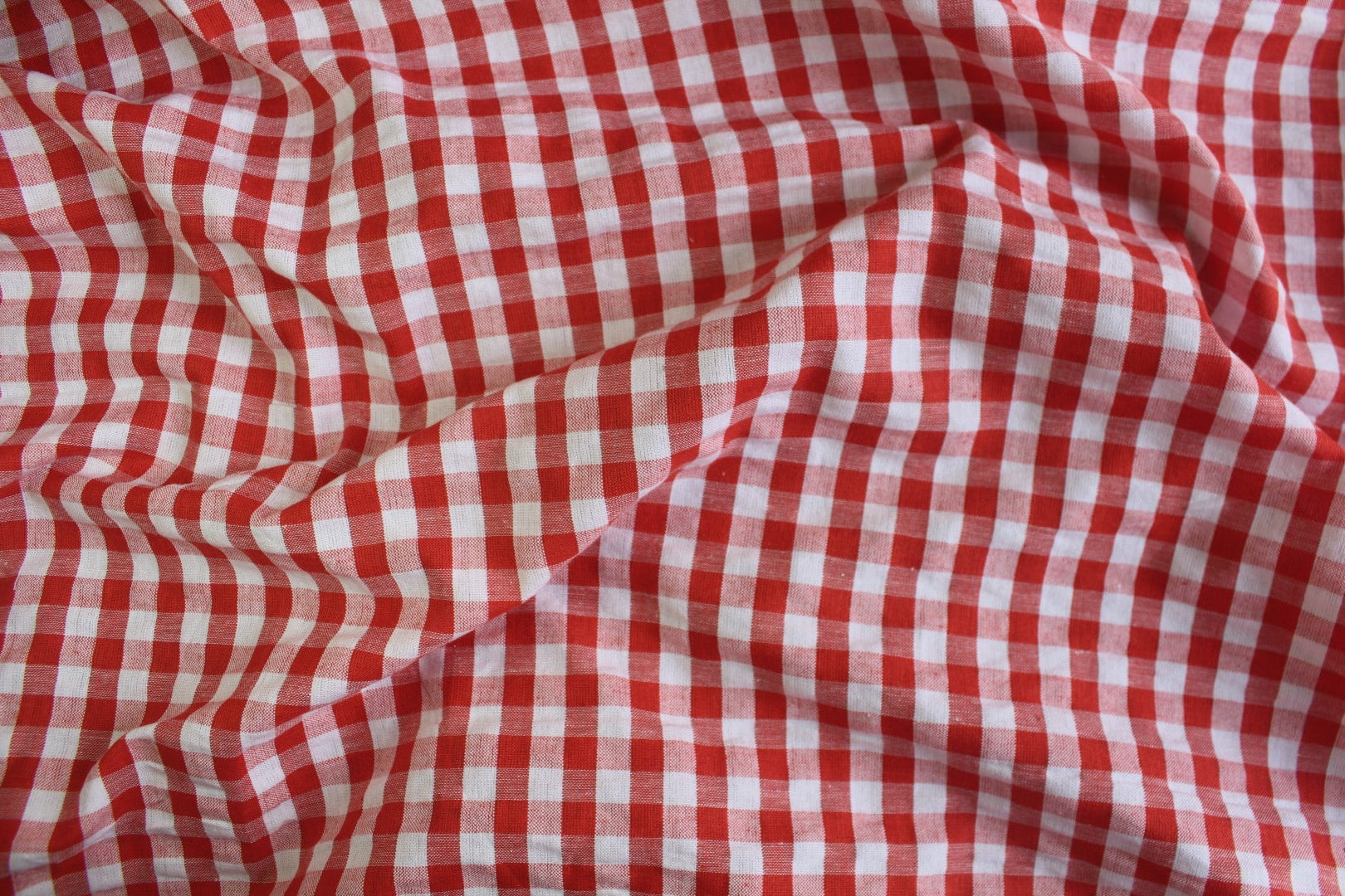 This eye-catching seersucker fabric boasts a classic gingham check pattern in bright red and crisp white, finished with a permanent puckered texture for breezy comfort and easy wear. The generous 59-inch width is ideal for wide garments, table linens, and other summer creations.